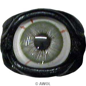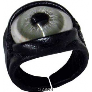 This one of a kind Asparagus Green eye ring is hand crafted with black genuine leather stretched over metal with open band design. It features with a high quality asparagus green real human glass eye, which make this ring a must-have collection for Halloween or parties.