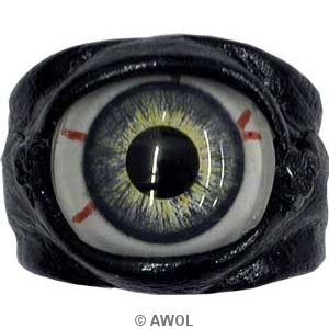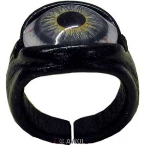 This one of a kind Blue eye ring is hand crafted with black genuine leather stretched over metal with open band design. It features with a high quality blue real human glass eye, which make this ring a must-have collection for Halloween or parties.