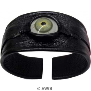 This one of a kind Green eye bracelet is hand crafted with black genuine leather stretched over metal with open-band design. It features with a high quality Green real human glass eye, which makes this bracelet a must-have collection for Halloween or parties.