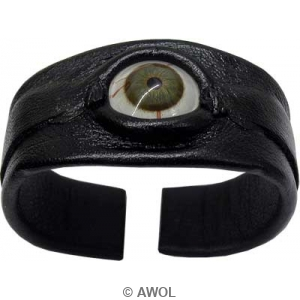 This one of a kind Hazel eye bracelet is hand crafted with black genuine leather stretched over metal with open-band design. It features with a high quality Hazel real human glass eye, which makes this bracelet a must-have collection for Halloween or parties.