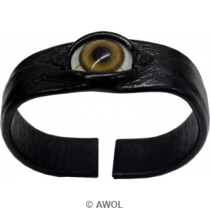 This one of a kind light brown eye bracelet is hand crafted with black genuine leather stretched over metal with open-band design. It features with a high quality light brown real human glass eye, which makes this bracelet a must-have collection for Halloween or parties.