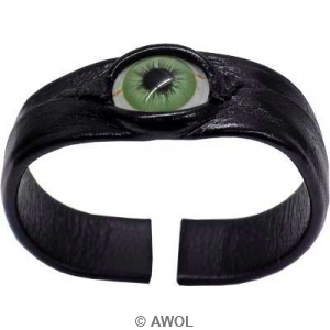 This one of a kind light green eye bracelet is hand crafted with black genuine leather stretched over metal with open-band design. It features with a high quality light green real human glass eye, which makes this bracelet a must-have collection for Halloween or parties.