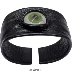 This one of a kind light green eye bracelet is hand crafted with black genuine leather stretched over metal with open-band design. It features with a high quality light green real human glass eye, which makes this bracelet a must-have collection for Halloween or parties.
