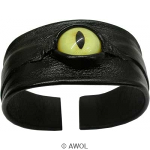 This one of a kind Yellow Cat eye bracelet is hand crafted with black genuine leather stretched over metal with open-band design. It features with a high quality yellow cat glass eye, which makes this bracelet a must-have collection for Halloween or parties.